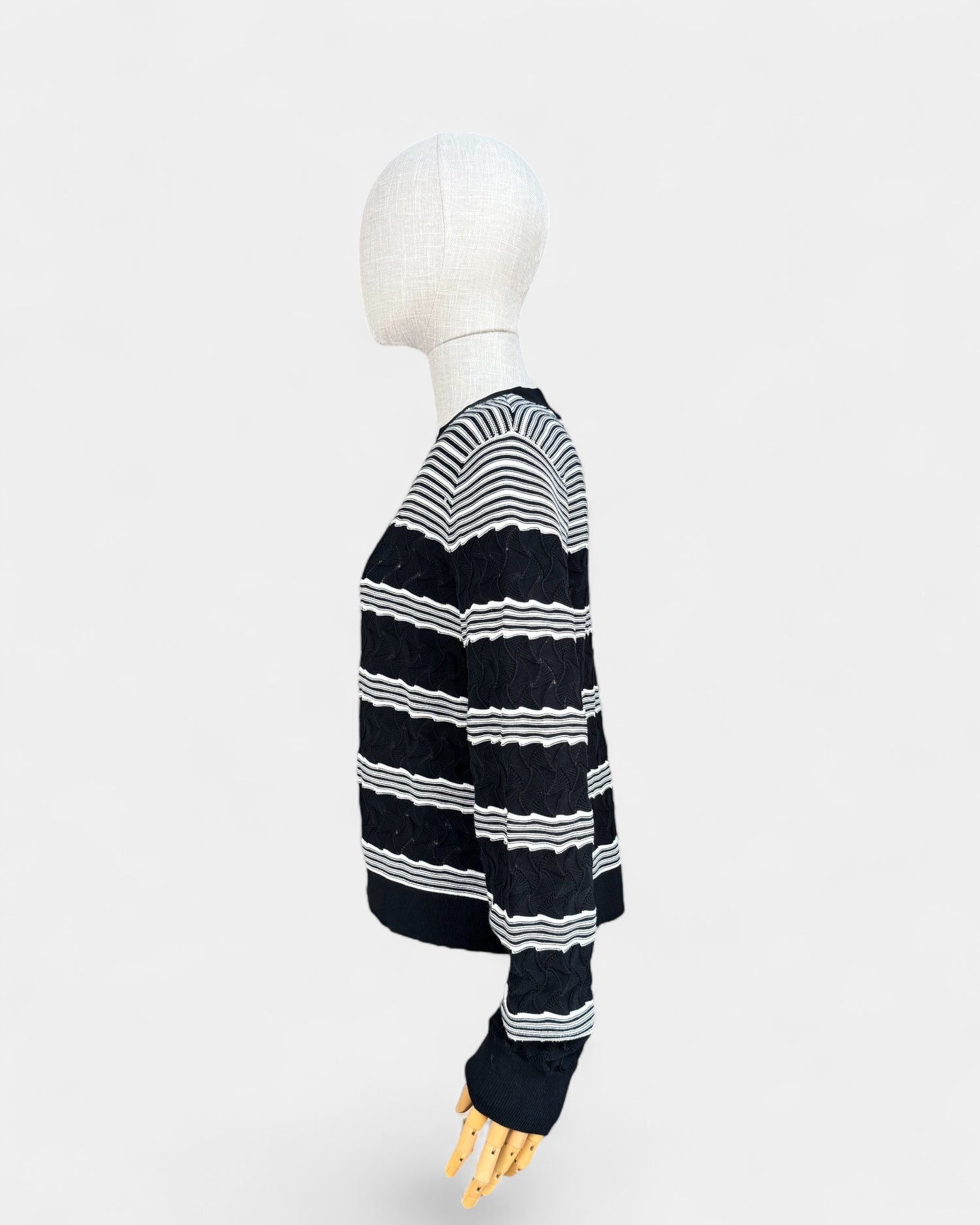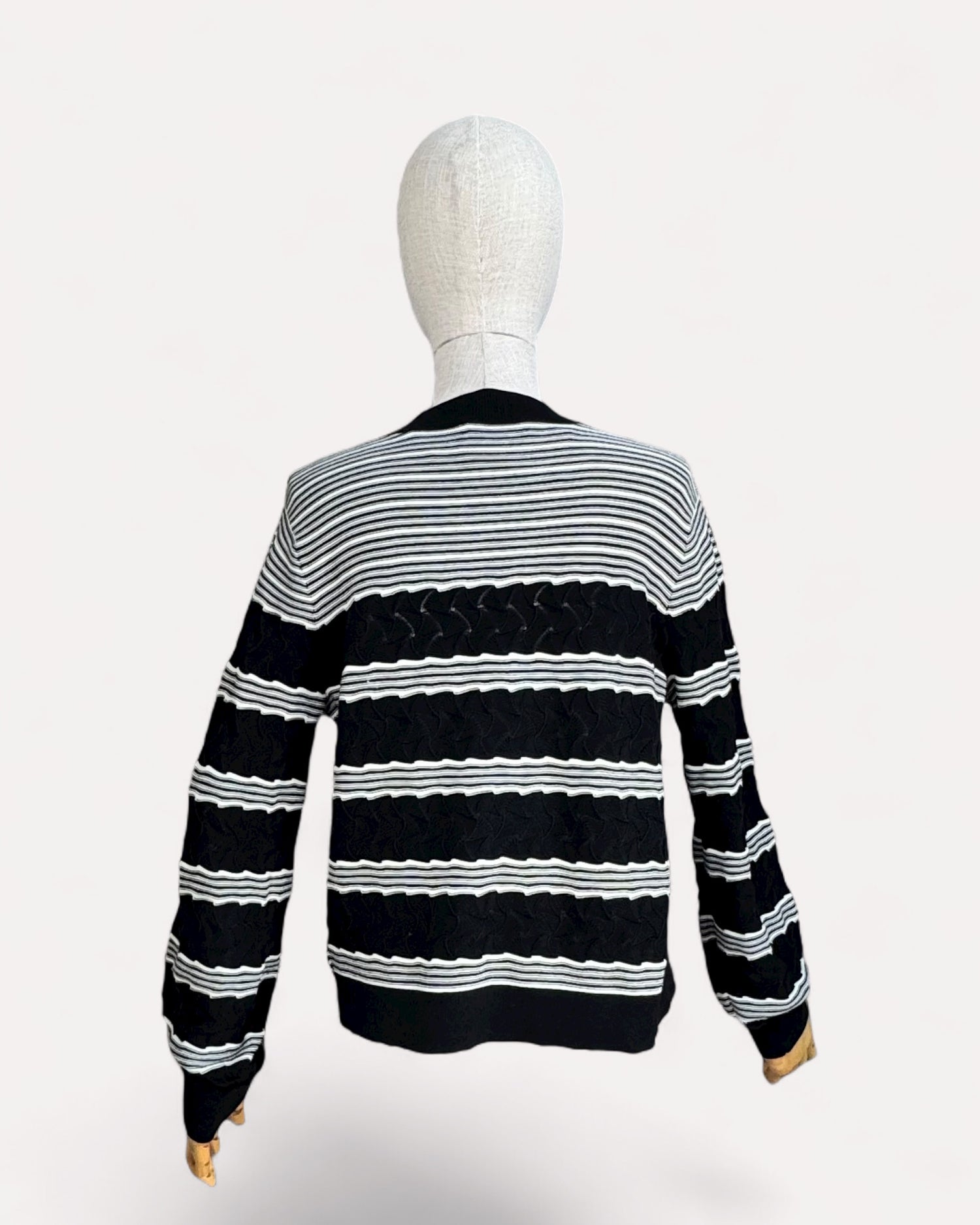 Pull à manches longues Club Monaco en maille épaisse, avec motif rayures noires et blanches. Encolure ronde et finitions côtelées aux poignets et à la base.